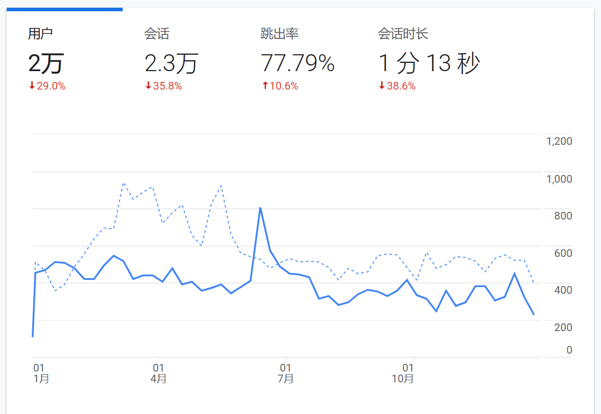 2022 小破站因为没什么文章产出,也不像大博主们有高留存用户,所以访问量比去年减少了很多。UV 2w、PV 2.3w、跳出率 77.79%、平均会话时长 1 分 13 秒。