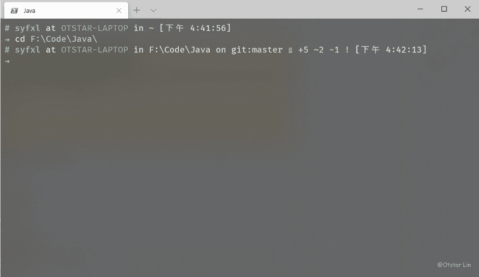 重新启动后,你就会发现终端的样式变了几乎和 oh-my-zsh 的外观一样了,并且也有 git 状态的提示了: