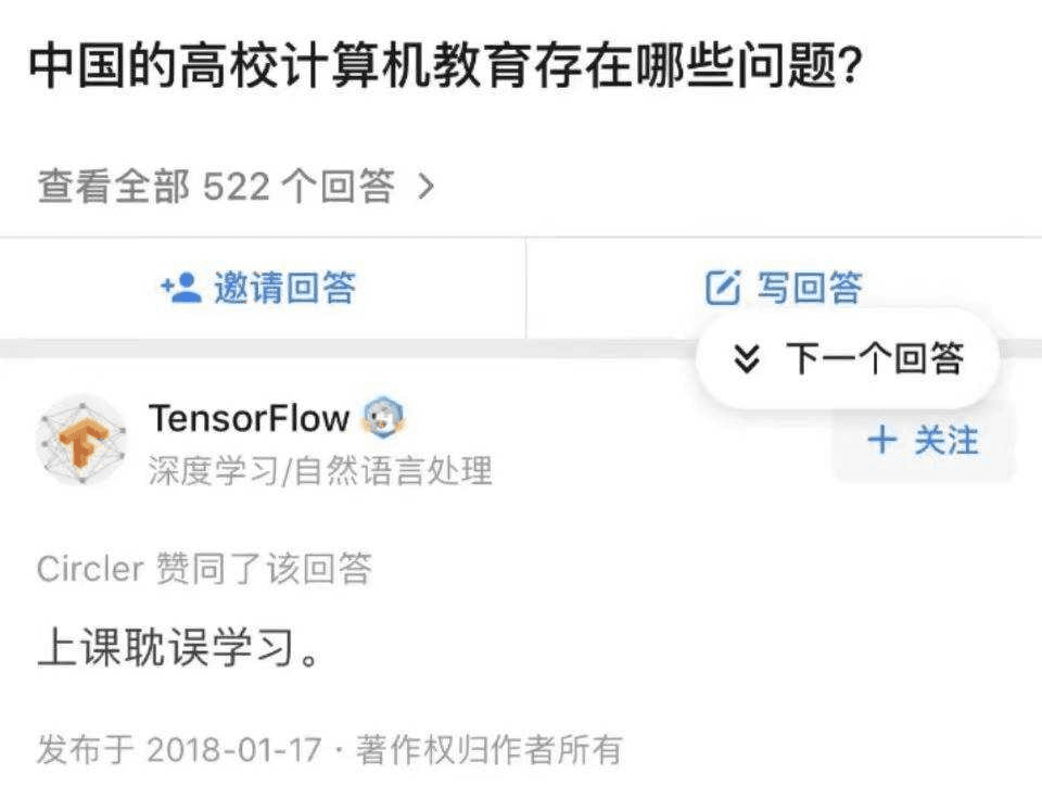 总之大二下对我来说算是一个非常重要的转折点,同时也把学习的方向切到了后端,虽然现在还在肝前端的代码,不过主要学习的东西已经是后端的了。另外也深刻的感受到了下图的回答是多么的精辟:
