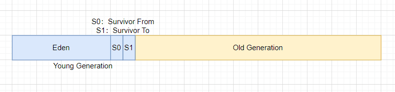 那么我们就以程序刚运行开始,首先我们知道 JVM 会将新对象分配到 Eden 区,Eden 不断的分配新的空间给程序使用,此时由于 Eden 区还未满,所以 Survivor From 区(下称 S0)、Survivor To 区(下称 S1)以及老年代都还未被使用,状态如下图所示: