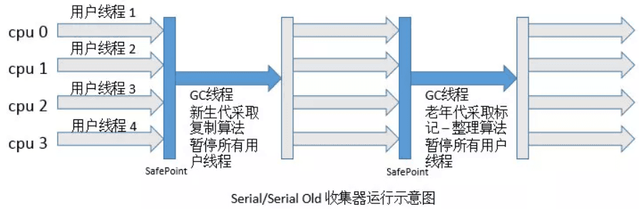 - Serial Old,用于老生代,采用标记-整理标记整理算法,回收时采用单线程的方式。进行垃圾收集的时候需要暂停其他线程(STW)。