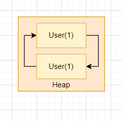 此种垃圾识别机制非常高效,原理简单,并且不需要 Stop-The-World。但是对于主流的 Java 虚拟机都没有使用这种识别机制。这是因为有非常多的例外需要考虑,比如循环引用的情况,此时计数就会有问题。如以下的例子,两个 User 对象互相引用对方,此时两者的引用计数都不为 0,所以垃圾回收器并不能回收这些内存。