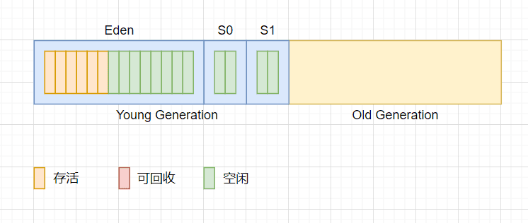 当程序运行一段时间后,Eden 区逐渐被使用满,同时部分对象也已经可以回收,状态如下图所示: