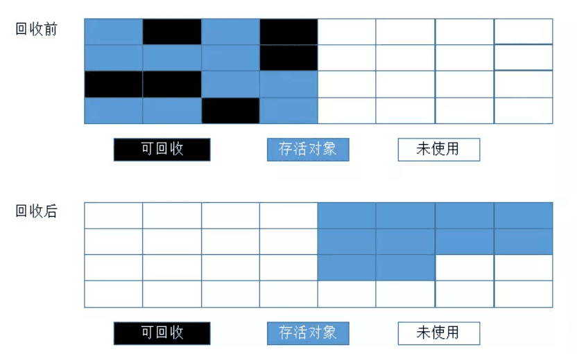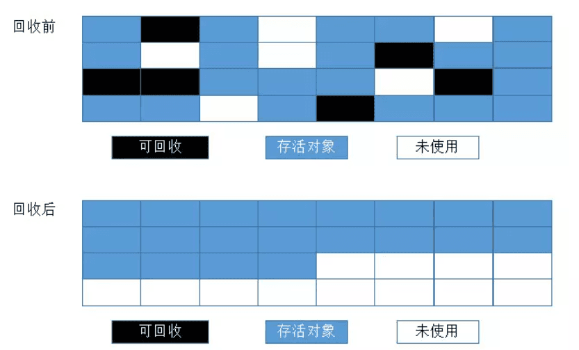 标记复制算法会浪费一半的空间,为了充分利用完整的空间,同时避免产生内存碎片,于是就有一种新的方式被提出来。当标记过程完成后,就将存活的对象向内存的一端移动,最后清理掉存活对象边界以外的空间。其回收前后的对比图如下: