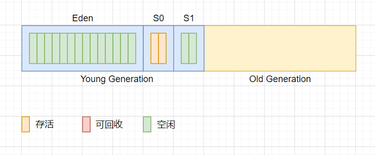 此时如果需要程序要求 JVM 为其分配一个 2 单位的连续空间,可以看到 Eden 只剩下一个单位的连续空间了,这时候为了能分配成功,JVM 会执行一次 Young GC(为了避免产生歧义这里都使用按区域划分的 GC 分类),Eden 的存活对象会移动到 S0,同时可回收的对象的空间也会被回收,状态如下图所示: