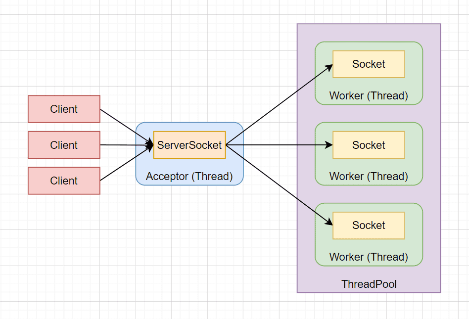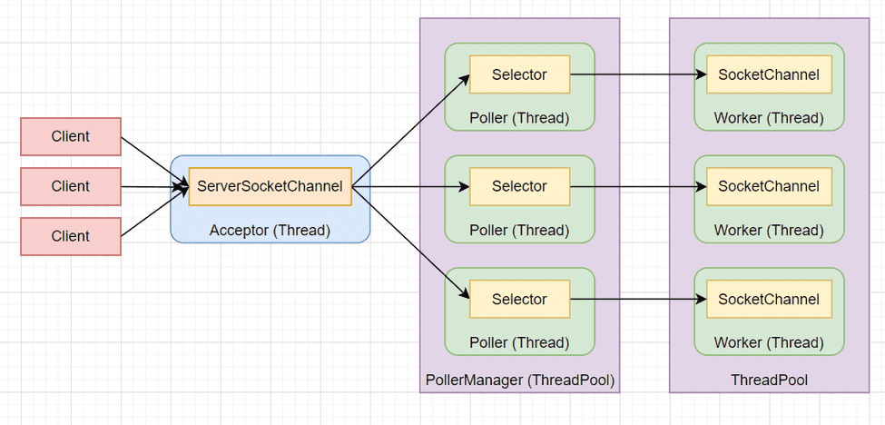这里的样例所使用的架构类似于 Jetty 和 Tomcat,由 Acceptor 负责接收请求,是阻塞的,接受到请求后将 SocketChannel 注册到 Poller 也就是 Selector 中,由 Poller 负责轮询可读和可写状态。本例为了简单一点将 IO 的处理放在了 Poller 中,实际的架构上应放到线程池中进行处理,解放 Poller,使其进行下一轮的轮询。同时本例只使用了一个 Acceptor 和 Poller,实际的架构中一般会设置多个。