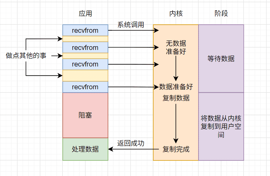 同步非阻塞 | 在咖啡店里排队等时一边玩着手机一边不断的检查是否到自己了 | 较低 |
