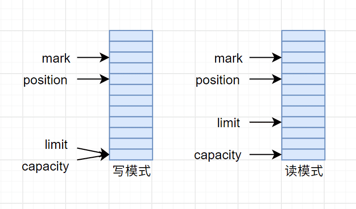Buffer 虽然可以进行读写操作,不过读写操作并不能同时进行,是半双工的,Buffer 分成了读模式和写模式,其切换的方法如下:
